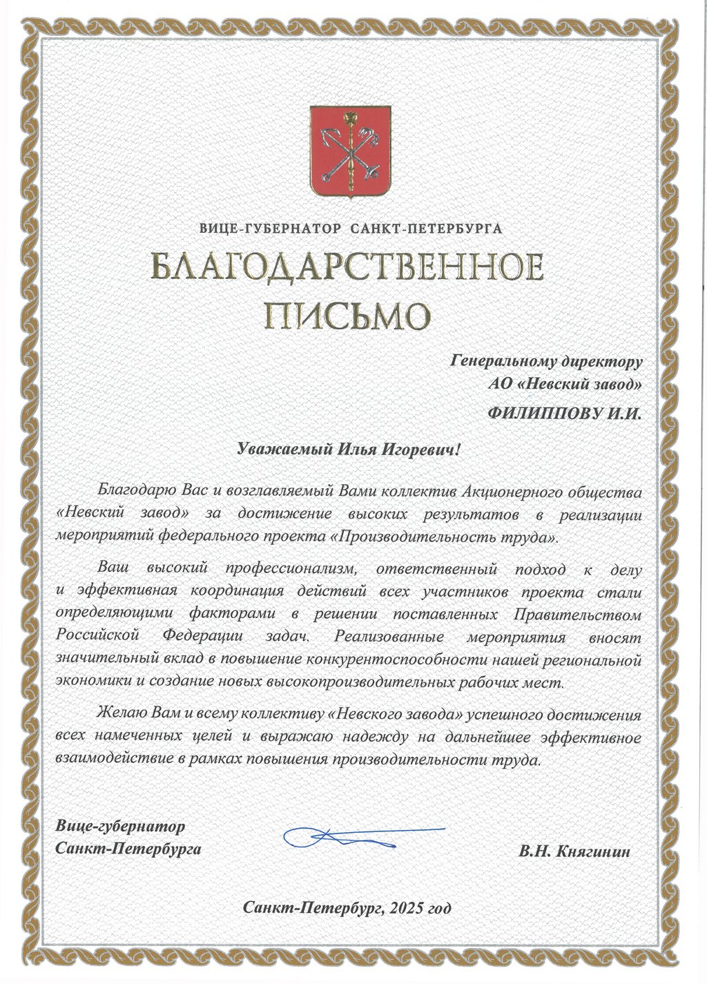 Коллектив Невского завода отмечен благодарственным письмом вице-губернатора Санкт-Петербурга