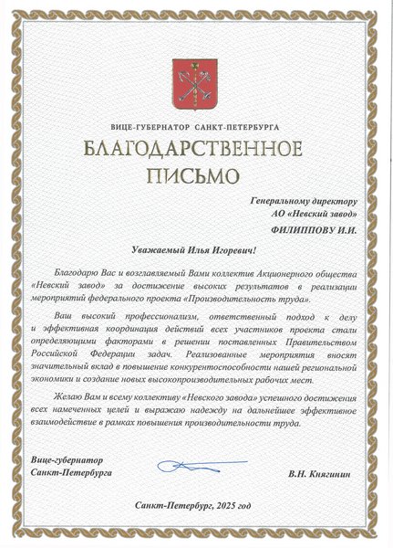 За достижение высоких результатов в реализации мероприятий национального проекта «Производительность труда» коллектив Невского завода отмечен благодарственным письмом вице-губернатора Санкт-Петербурга.